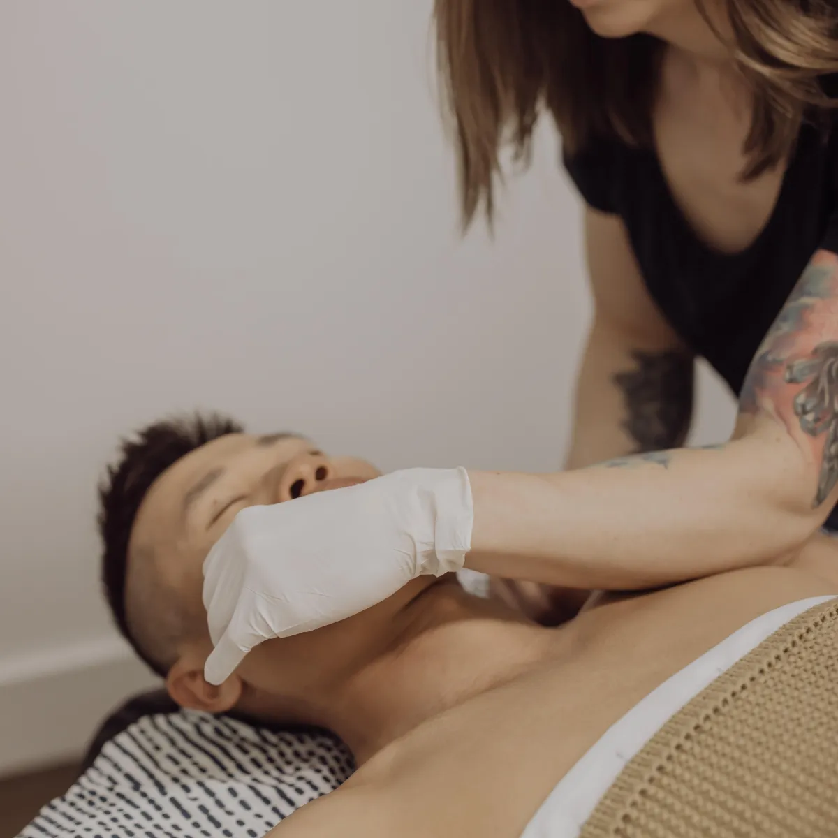 A treatment designed specifically to aid in relieving jaw pain. If you experience clicking or popping of your jaw, stiffness, headaches, and trouble chewing some foods, this focused treatment will help relieve these symptoms. Includes treatment of the upper back, neck, scalp, and jaw (inc. optional inside the mouth).